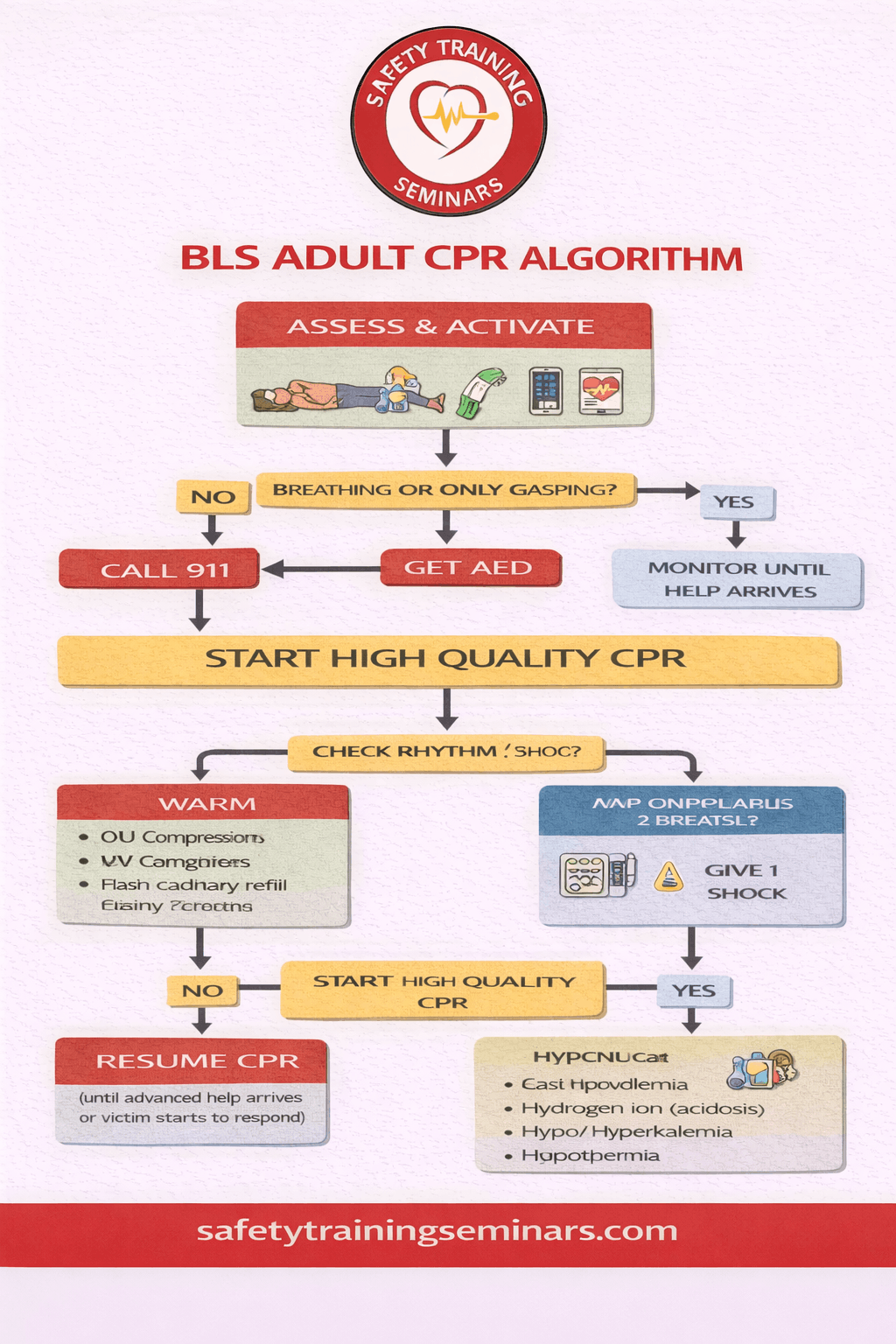 The BLS adult CPR algorithm is a step-by-step guide for rescuers to recognize cardiac arrest, provide high-quality chest compressions, ventilations, and use an AED when indicated. Safety Training Seminars teaches this algorithm clearly in BLS courses to improve survival rates.