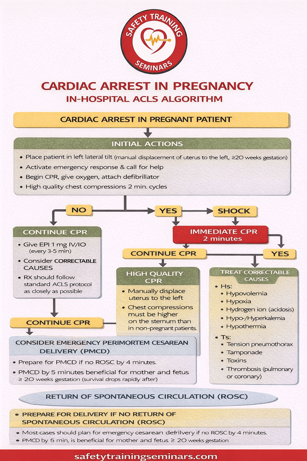 This algorithm adapts standard ACLS for pregnant patients. It includes maternal resuscitation, left uterine displacement, and perimortem cesarean considerations. Safety Training Seminars teaches pregnancy-specific emergency care.