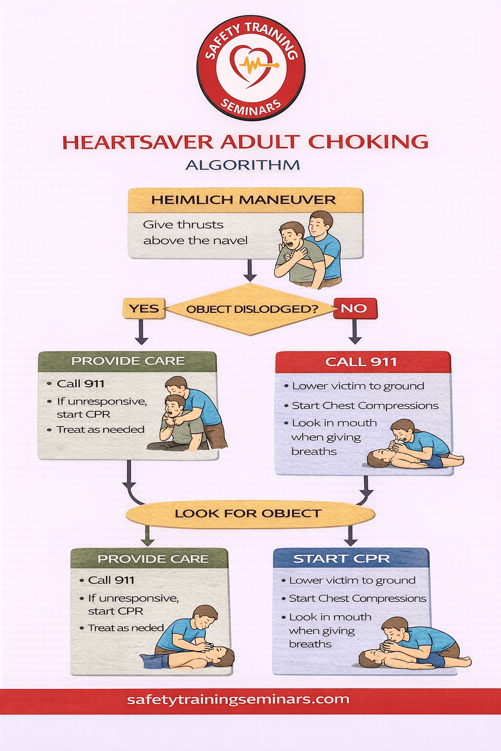 The Heartsaver adult choking algorithm is a step-by-step protocol used to help a conscious or unconscious adult who is choking due to a foreign body airway obstruction. It teaches responders when to use abdominal thrusts, back blows, and CPR. Safety Training Seminars covers this clearly in Heartsaver CPR AED courses.