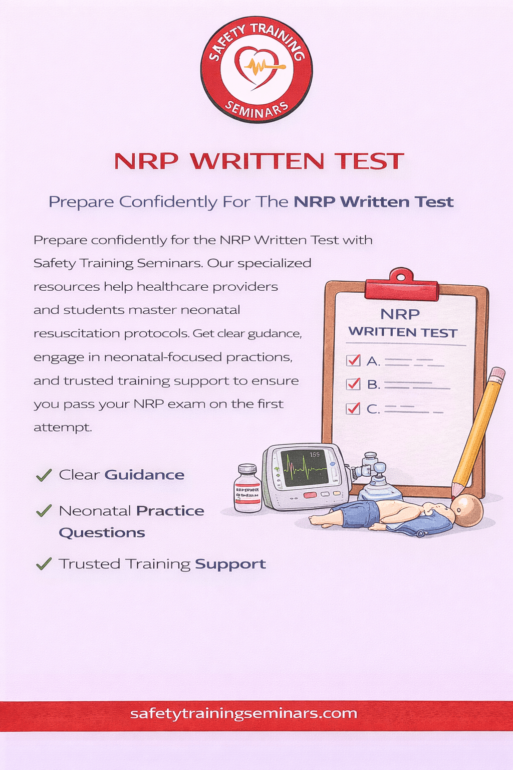Safety Training Seminars offers comprehensive NRP Written Test preparation designed for healthcare professionals aiming for neonatal resuscitation certification. Master newborn assessment, resuscitation protocols, medications, and critical decision-making through exam-focused, AHA-aligned content. Expert-crafted resources, proven study strategies, and nationwide trusted training empower confidence, compliance, and first-time test success.